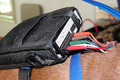 The first step, of course, is to gather all of your equipment together. Because we aren't using a vest with a pocket, we had to come up with a way to keep the monitor from sliding backward or to either side of the dog. The holter monitor we purchased from Alba Medical came with a case that has a loop on the back, so we attached that to a harness that the dog wears during the monitoring.